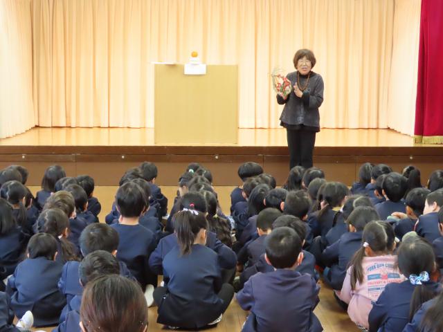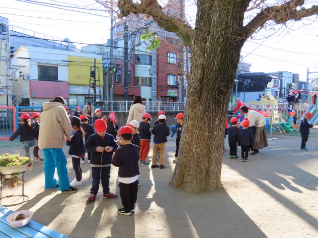 年長が育てたお米の藁で作った松飾りを飾り、新年を迎え3学期が始まりました。「あけましておめでとうございます。」の声が飛び交います。照れながらの挨拶や全員の先生に一人ずつ挨拶をするなど微笑ましい登園後はお庭でお正月遊びです。コマ回しや羽根つき、ひも巻きの大変がわかって、羽根つきを始めたり、黙々とひもを巻いたりして朝の時間を過ごしてホールで始業式をしました。お休みも少なく元気に3学期が始まりました。年長は2月になると給食センター見学と試食、白糸台小学校の1年生からご招待も受けました。